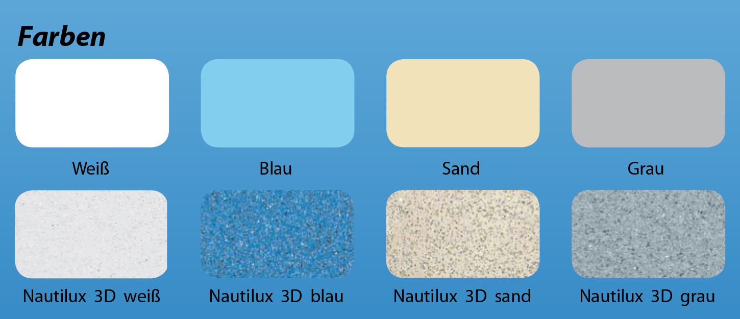 In diesen Farben sind die Nautilus Polyesterbecken im Mehrschichtaufbau erhältlich: