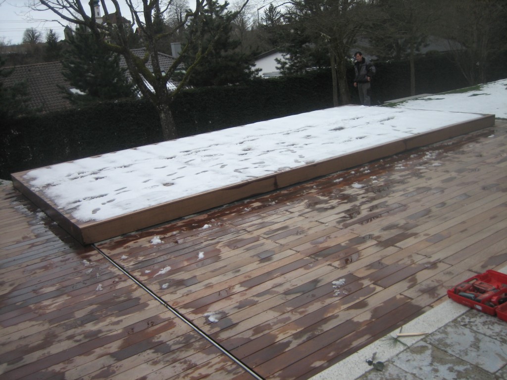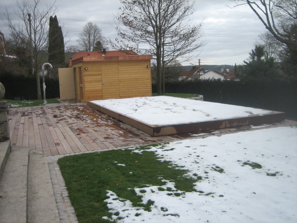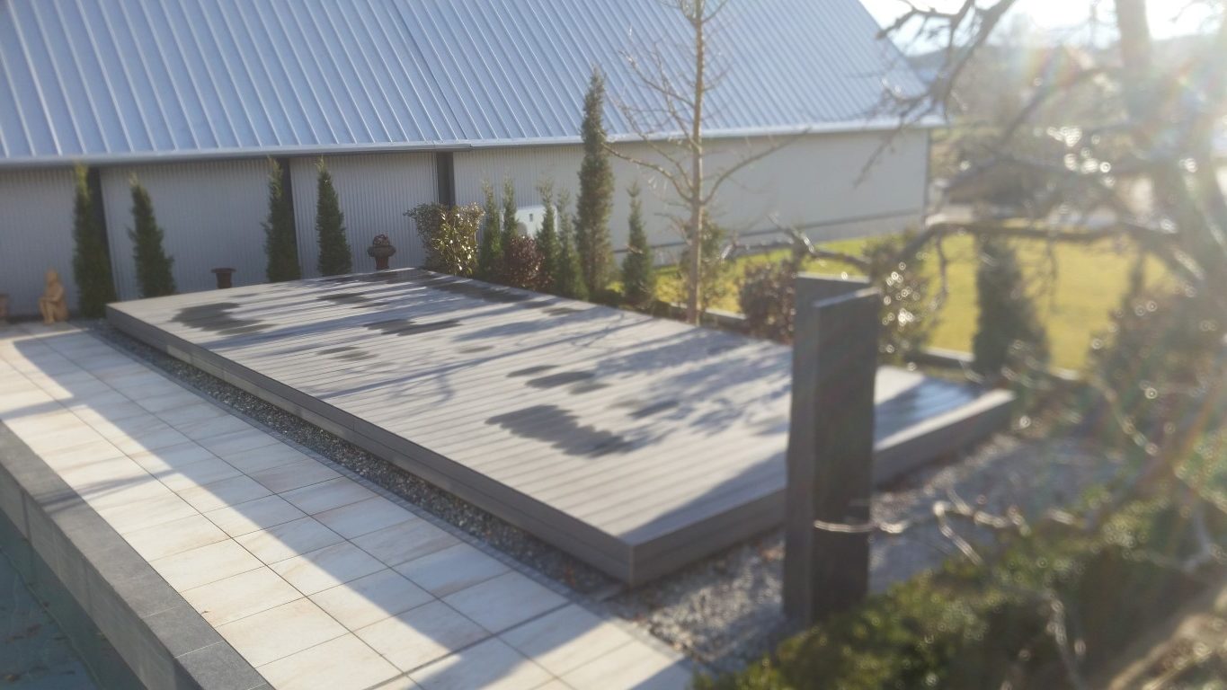 Ein Pooldeck ist eine fahrbare, zum Beispiel aus Holz verleidete Schwimmbadabdeckung.